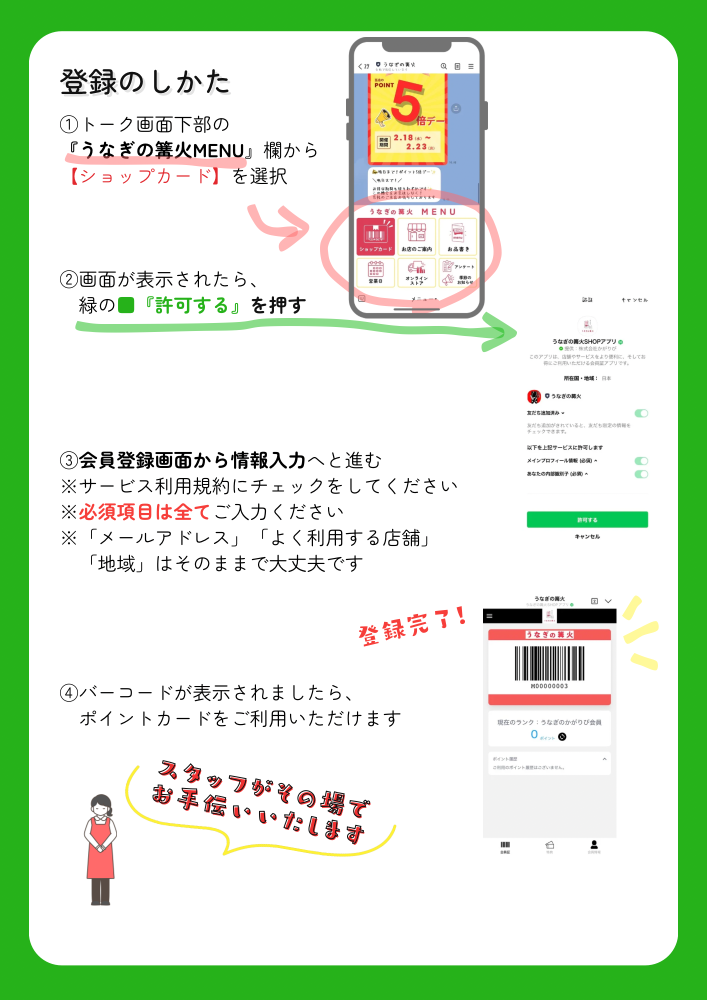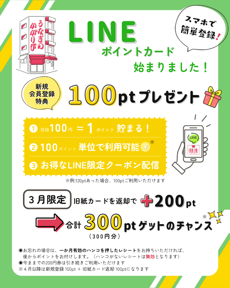 いつもうなぎの篝火をご利用ありがとうございます。3/4(水)より、ポイントカードが紙カードからLINEポイントカードへと生まれ変わりました✨🟢LINEの方はトーク画面の、メニュー欄からご登録いただけます!詳しくは画像をご覧ください